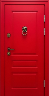 Металлическая термодверь с окрашенными красными панелями МДФ RAL с кнокером лев КД-1409