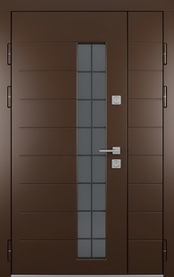 Входная полуторастворчатая термодверь с остеклением и панелями МДФ коричневого цвета КД-1454